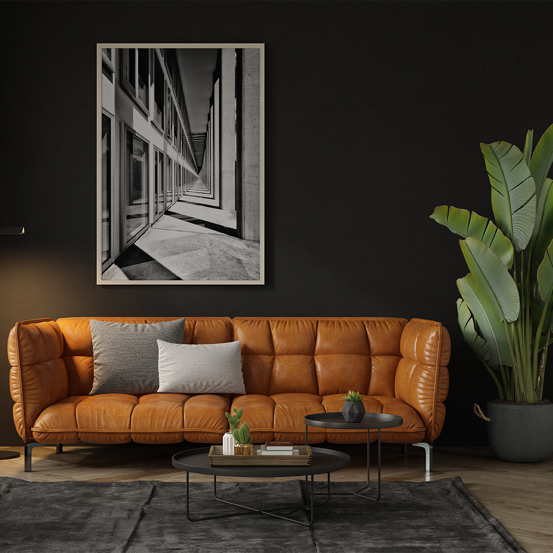 - How It Transforms the Room: The monochrome style contrasts beautifully with the warm orange tones of the sofa, creating a dynamic focal point.