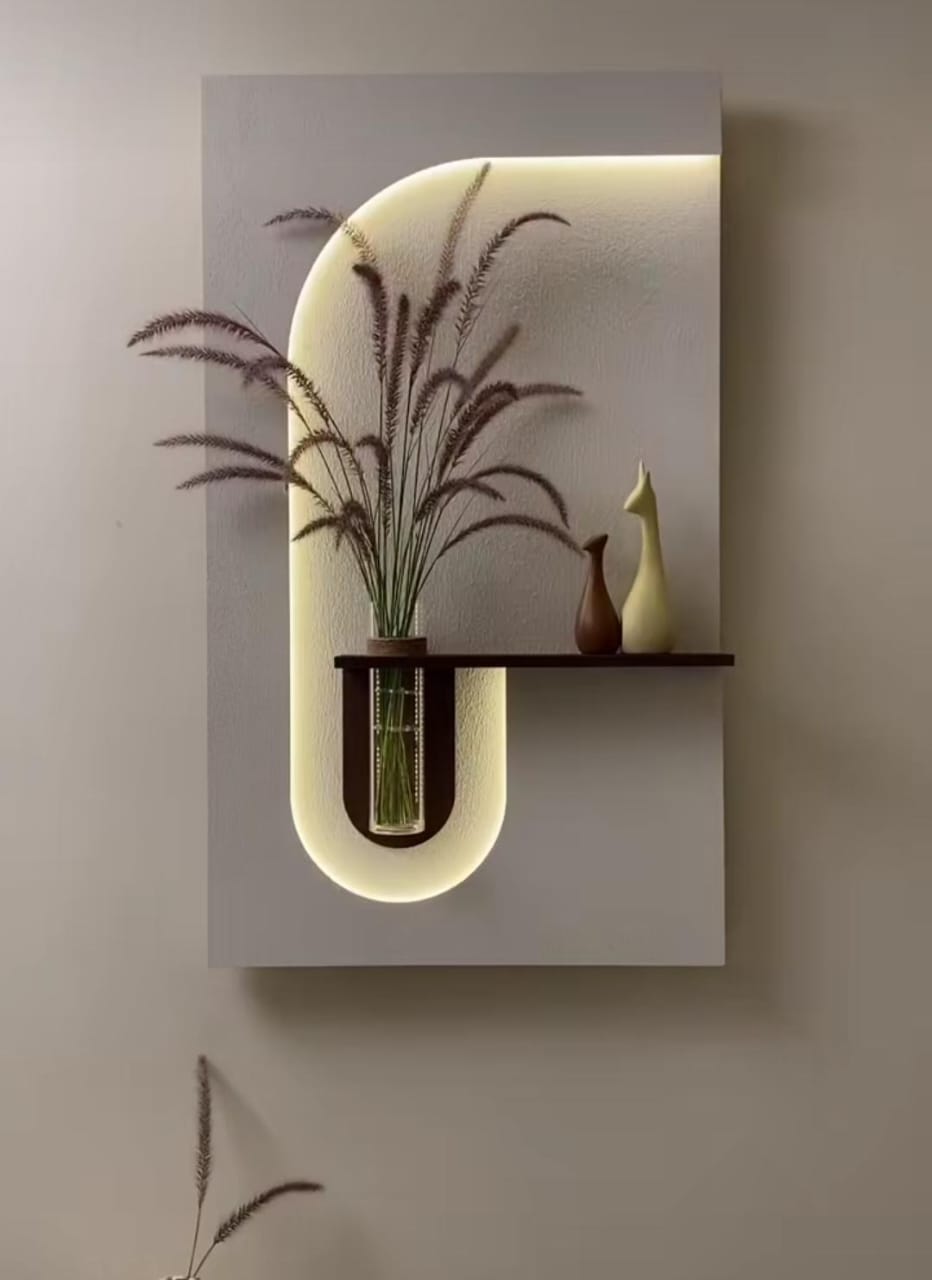 Transform your home with the BloomBeam, a sophisticated wall décor piece that seamlessly combines soft ambient lighting, a sleek wooden shelf, and an elegantly crafted vase.