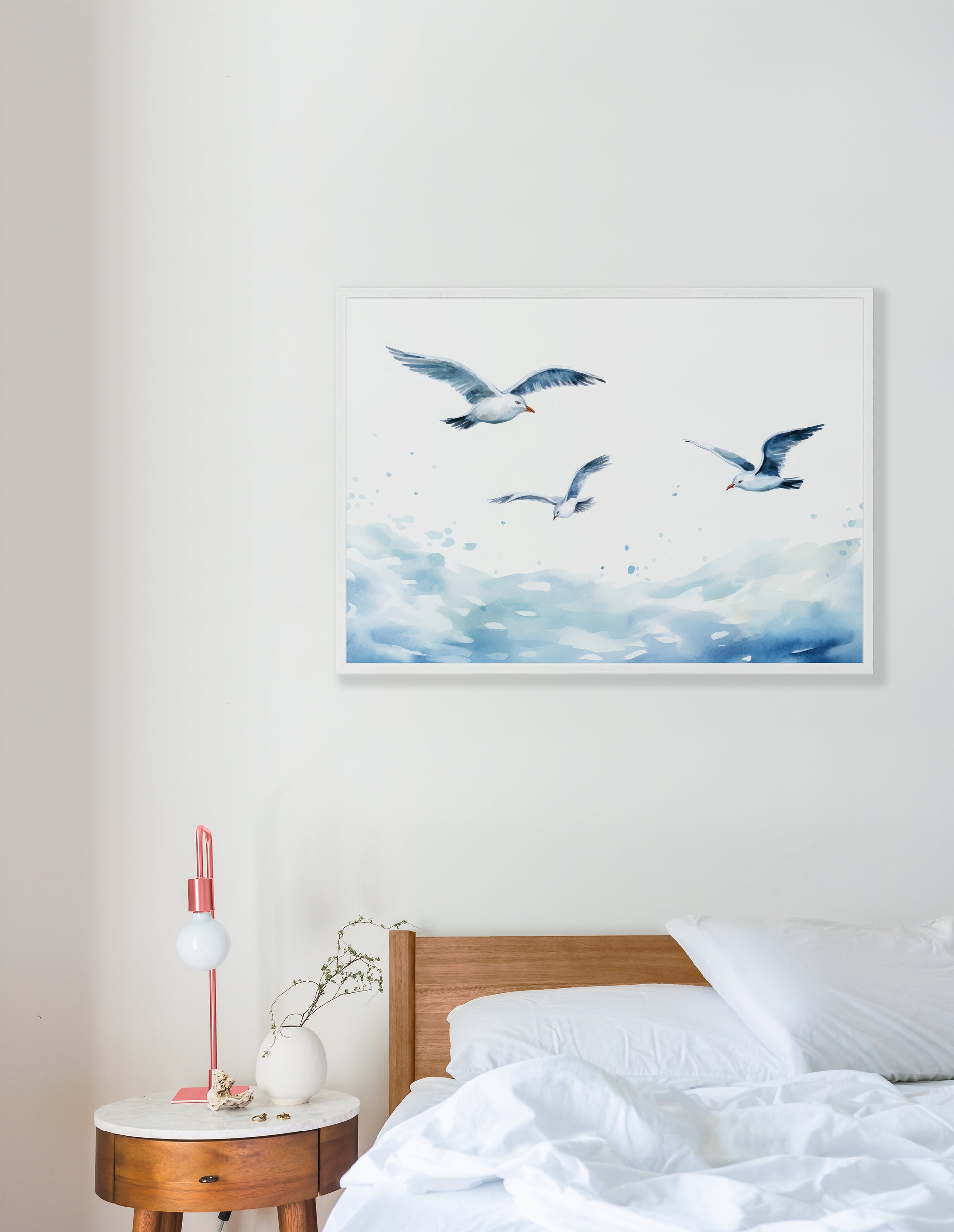 Feel the calm and freedom of seagulls gliding above serene ocean waves.