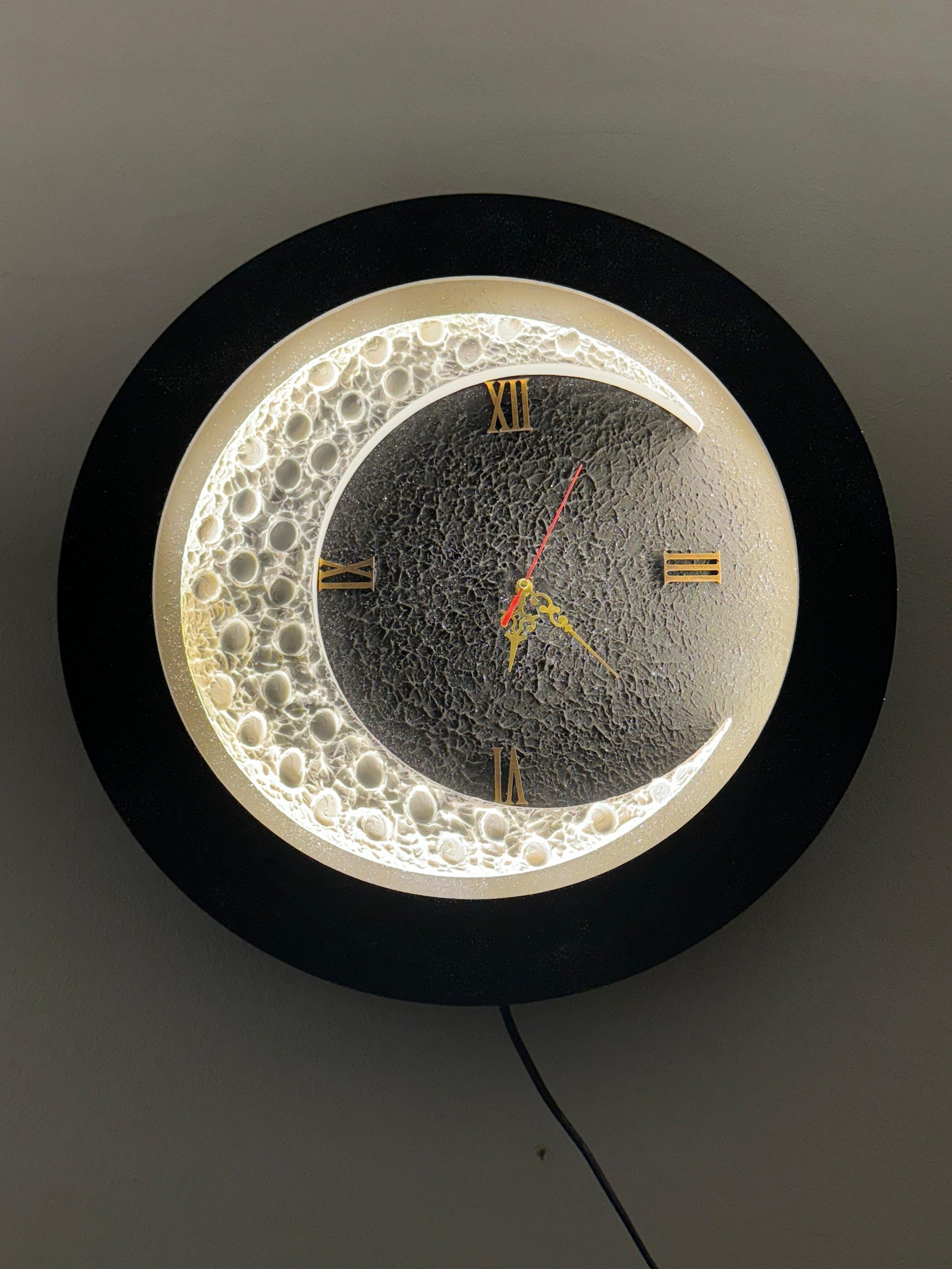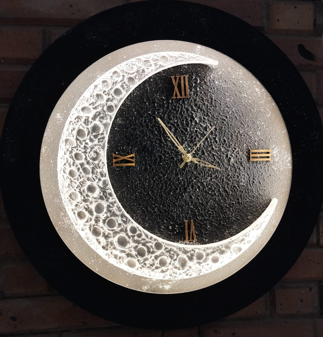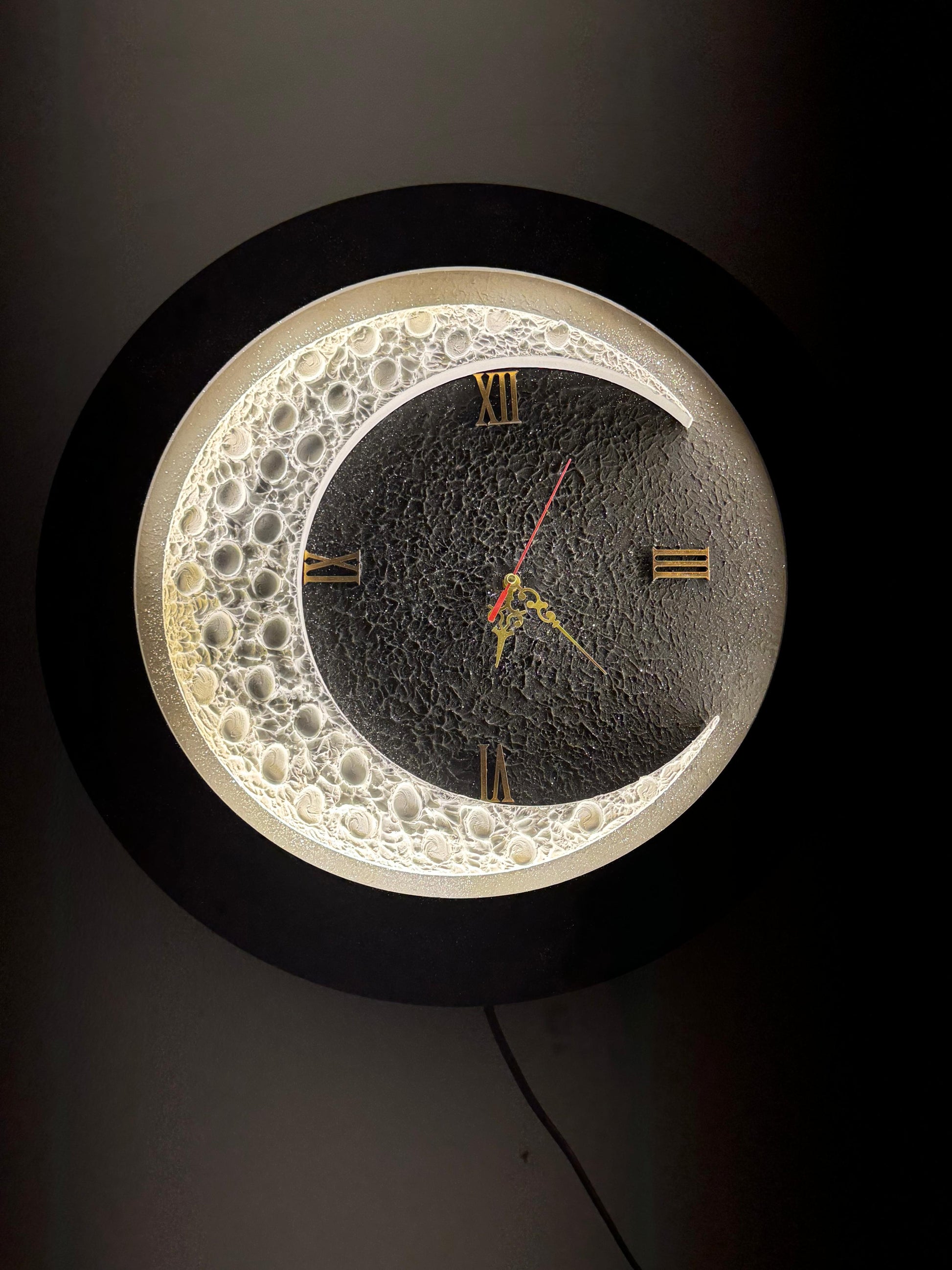 Experience the serenity of moonlight with this beautifully crafted clock. Its radiant crescent design and textured finish evoke the quiet beauty of the night, making it both a functional and artistic statement.
