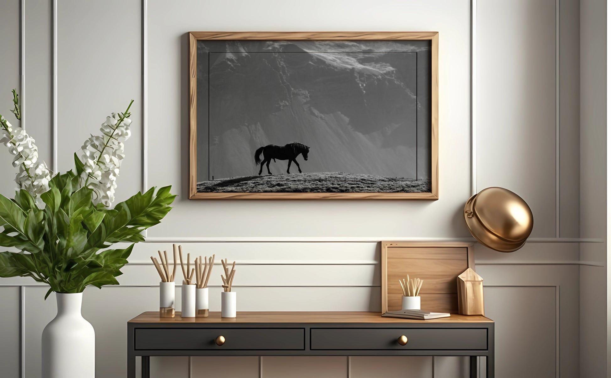 Description: A majestic black horse walks across a windswept landscape, symbolizing freedom and elegance.