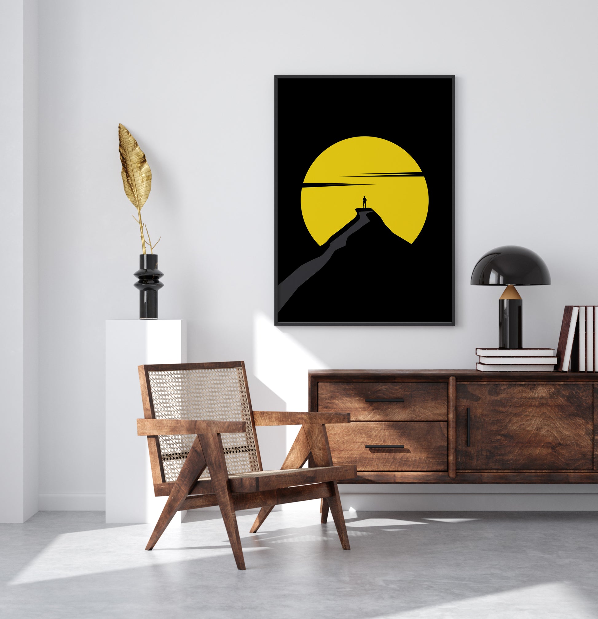 This minimalist artwork captures a lone figure standing atop a mountain, silhouetted against a radiant yellow sun. It symbolizes the triumph of reaching personal heights and the serenity of solitude. Perfect for inspiring moments of reflection, "Solitude Summit" adds a modern yet soulful vibe to your space.