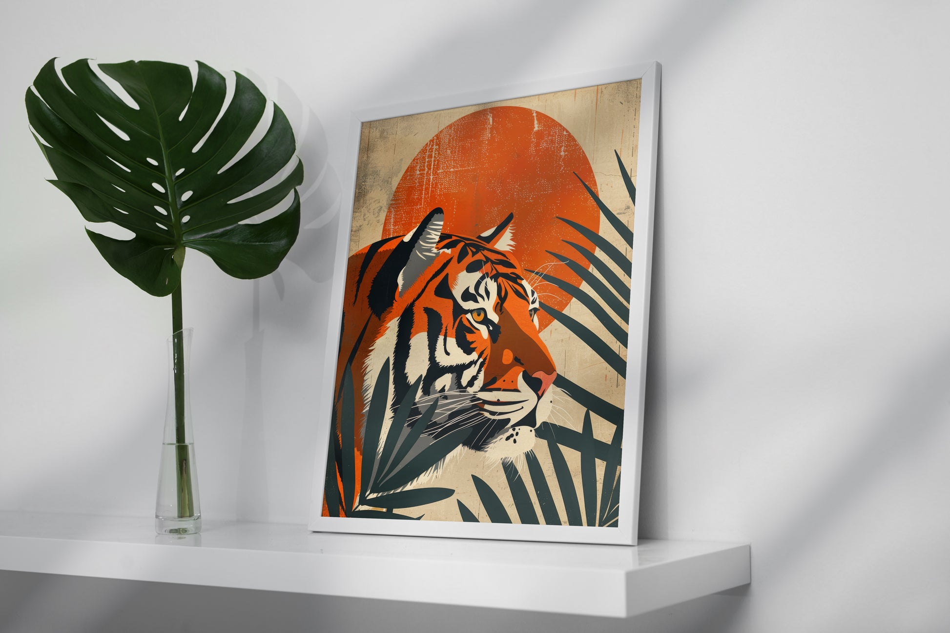 This vibrant tiger illustration, set against a bold orange sun and lush foliage, radiates power and serenity.